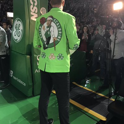 The former Celtic and current sideline reporter wore a glorious green jacket to the team's game against the Magic on ...